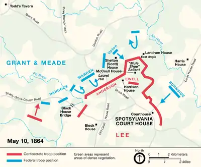 De konfødererede kom først til Spotsylvania og den 9. maj begyndte begge hære at tage stilling nord for den lille by. Da Unionsstyrker undersøgte den konfødererede forpostlinje den 9. maj, for at finde ud af hvor fjenden var placeret, blev kommandøren for Unionens VI Korps, generalmajor John Sedgwick, dræbt af en snigskytte. Han blev efterfulgt af generalmajor Horatio G. Wright. Lee placerede sine mænd i en skyttegravslinje, som strakte sig mere end 6,5 km med artilleri placeret, så det kunne beskyde enhver angriber i siden. Der var kun en større svaghed i Lee's linje, et udsat fremskudt område, som blev kendt som "Mule Shoe" (muldyrskoen), som strakte sig over 1½ km foran hovedlinjen. Lee gennemskuede denne svaghed under kampen den 10. maj, da 12 unionsregimenter under kommando af oberst Emory Upton fulgte op på et intenst artilleriangreb med at ramme ind i tåen på Mule Shoe langs en smal front. De gennembrød de konfødereredes linje, og Andet Korps havde meget svært ved at drive dem tilbage. Uptons angreb betød, at han på stedet blev forfremmet til brigadegeneral, og det blev lærebogseksemplet på, hvordan man gennembryder en fjendtlig skyttegravslinje. Tilsvarende taktik blev anvendt af Tyskland i Operation Michael, den succesfulde forårsoffensiv i 1918 under 1. verdenskrig. Andre Unionsangreb den 10. maj var knap så succesfulde, og dagen var generelt karakteriseret af ukoordinerede frontalangreb, som Grant impulsivt beordrede. Gentagne angreb var især uden resultat langs konføderationens venstre flanke, hvor det mange gange mislykkedes for general Warren at storme en position kaldet Laurel Hill.
