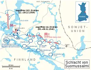 I mellemtiden var den sovjetiske 44. division, som fortrinsvis bestod af ukrainske tropper, rykket frem fra øst mod Suomussalmi. Den lå forskanset på vejen mellem Suomussalmi og Raate og blev fanget i tilbagetrækningen af de andre sovjetiske styrker.