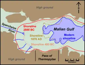 - Sett fra øst fra livius.org. Til venstre er klippene i syd, til højre er vejen og kanten af det jordbrugsområde, som engang var Malisbugten.
