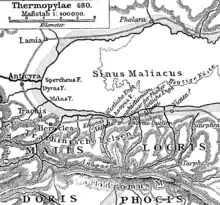 På denne tid bestod passet ved Thermopylæ af et smalt stykke vej langs kysten af Malisbugten, så smal at kun én hestevogn kunne passere ad gangen.[7] Sydsiden af passet var afgrænset af klipper, mens nordsiden stødte op til bugten. Langs den vej var der tre indsnævringer, "porte" (pylai), og i midten var der en kort mur bygget af fønikerne et århundrede før som forsvar mod thessaliske invasioner.[8] Navnet Thermopylæ betyder "de varme porte" efter egnens varme svovlkilder.