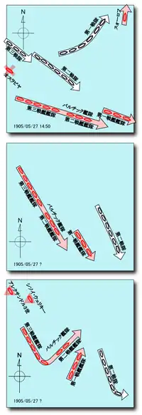 Russerne kom sejlende fra syd-sydvest mod nord-nordøst. Den japanske flåde kom fra vest mod nordøst og fortsatte mod et kontaktpunkt, som kun gjorde det muligt for de fremadrettede kanoner at skyde, hvilket gjorde det muligt at undgå beskydning fra de fleste russiske kanoner.[25] Admiral Tōgō gav flåden ordre til at dreje efter tur i sekvens, hvilket gjorde det muligt for hans skibe at følge den samme kurs som russerne, selv om det udsatte hvert af skibene for beskydning efter tur. Denne vending lykkedes. Rozjestvenskij havde kun to muligheder: at dreje alle skibe mod fjendens linje eller at indlede et opstillet slag.[25] Han valgte det sidste, og kl. 14.08 blev det japanske flagskib Mikasa ramt på 7.000 meters afstand, mens japanerne svarede igen på 6.400 meters afstand. Herefter begyndte den overlegne japanske skydeteknik at gøre sin virkning[26] og de fleste af de russiske slagskibe blev beskadiget. Da søslag normalt begyndte på en betydelig kortere afstand, opnåede Tōgō straks overraskelsens fordel.