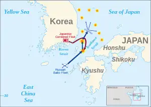 Russerne havde valget mellem tre mulige ruter til Vladivostok: La Pérouse, Tsugaru, og Tsushima. Admiral Rozjestvenskij valgte Tsushima i et forsøg på at forenkle ruten. Admiral Tōgō, som havde base i Pusan i Korea, regnede også med, at Tsushima ville være den vej, russerne valgte. Tsushimastrædet er farvandet øst for Tsushima øgruppen, som ligger halvvejs mellem den japanske ø Kyushu og den koreanske halvø og er den korteste og mest direkte vej fra Indokina. De andre ruter ville have betydet, at stillehavseskadren skulle sejle øst om Japan. Den samlede japanske flåde og den russiske 2. og 3. stillehavseskadre fra Europa ville komme til at kæmpe i stræderne mellem Korea og Japan nær Tsushimaøerne.