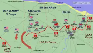 Imidlertid kom 30. korps i kamp med Panzerlehrdivisionen om besiddelsen af Tilly-sur-Seulles og kunne ikke trænge frem[39][40][41] mens 51. division mødte hård og fortsat modstand fra 21. panserdivision i sit forsøg på at trænge sydpå til Saint Honorine. Da 50. division ikke kom nogen vegne blev offensiven øst for Caen afblæst den 13. juni.[42] På højre flanke af 30. korps havde den tyske 352. infanteridivision været i kontakt med den amerikanske 1. infanteridivision siden landgangen på Omaha Beach på D-dag. Da de ikke havde fået ret megen forstærkning, var 352. division ikke i stand til at modstå det fortsatte amerikanske pres, og begyndte at give efter og trække sig mod syd.[36] Herved åbnedes der et 12 km bredt hul i de tyske linjer mellem det amerikanske 5. Korps og 30. Korps. [43]
