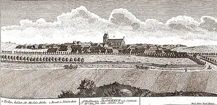 Træ kirken blev efterfølgende erstattet af en mere kostbar teglstenskirke på den 55 meter høje bakke, hvor den nuværende kirke ligger.