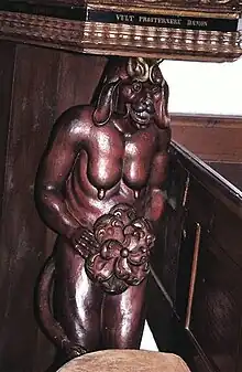 Et kvindeligt, troldelignende væsen med lange bryster, udført i egetræ, tjener som karyatide under prædikestolen i Vejlø kirke, og regnes som inspireret af Slattenpatten. [5]