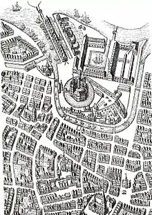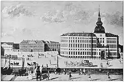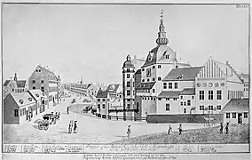 ![]() Slotsholmen i 1674 med Københavns Slot i midten og Christian 4.s Børs og krigshavn øverst i billedet  | ||||||||||||||||||||||||||
