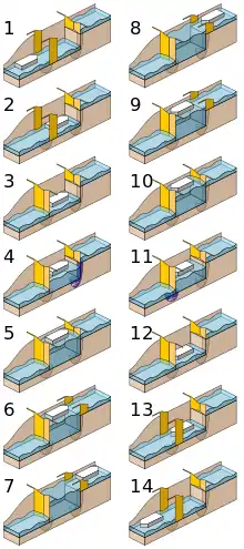 Løfteværk: Kammeret hviler enten på hydrauliske presser, eller det bæres af søjler, anbragte oven på hule svømmere af jern, som er i stand til svømmende at bevæge sig op eller ned i store vandfyldte brønde, anbragte under kammeret, hvorved dettes vægt modvirkes af den på svømmerne virkende opdrift. Styringen af kammeret sker ved, at det er forsynet med sideruller, som bevæger sig mod skinner, anbragte på et uden om løfteværket bygget jernstillads af gitterkonstruktion. Kammerets bevægelse iværksættes i reglen ved, at der sørges for, at der findes noget mere vand i dette under nedgangen end under opgangen, hvilket let kan opnås ved, at kammeret såvel under op- som under nedgangen stoppes op, lidt før dets vandspejl er kommet i højde med det tilsvarende niveau, og man må da, før skibet kan bringes ind i eller ud af kammeret, enten indlede eller henholdsvis aflede vand, før kammerets lukke og et tilsvarende anbragt som afslutning af det vandareal, med hvilket kammeret skal sættes i forbindelse, kan åbnes. Reguleringen af kammerets bevægelse sker ved 4 kæder eller ved 4 lodrette styreskruer, een ved hver af kammerets 4 hjørner, og som, idet de følges ad, når de bevæges, bevirker, at kammerets 4 hjerner følges ad.[6]