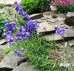 Blomstringen sker i juli, hvor blomsterstænglerne rejser sig højt op over bladtuen. Stænglen bærer spredte blade med én stor, klokkeformet, lyseblå blomst ved hvert bladhjørne på skuddets yderste halvdel. Frugten er en kapsel med mange, spiredygtige frø.