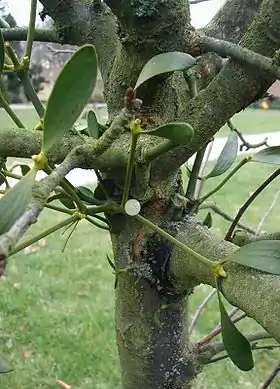 Planten almindelig mistelten (Viscum album) vokser ikke blot på træer, men vokser ind i træet, hvor den forbinder sig med dets karsystem for vand og næringssalte (xylemet), som den drager fordel af.[2] Almindelig mistelten har grønne blade og dermed klorofyl, og kan selv lave fotosyntese og producere sin egen sukker. Derfor kaldes den en halvsnylter. Andre eksempler på halvsnyltere er arter i slægten skjaller (Rhinanthus) og troldurt (Pedicularis).