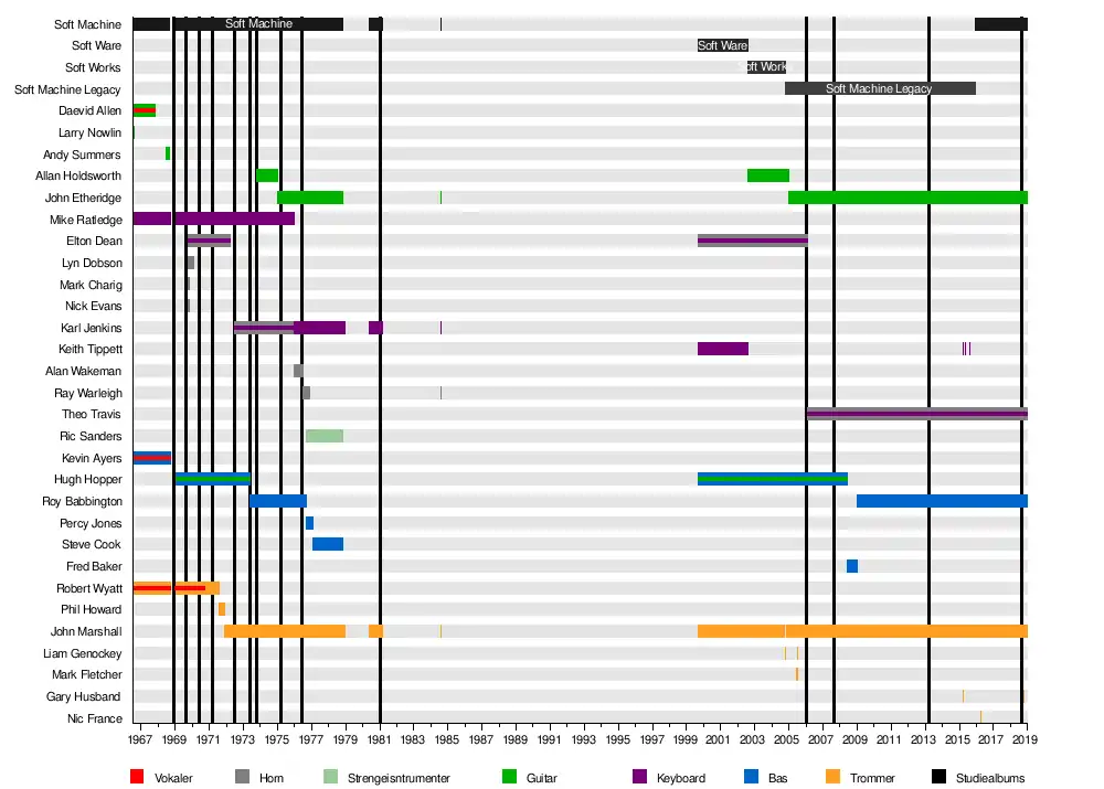 1966–1968, 1969–1978, 1980–1984, 2015–present 1978–1983 (as Soft Head/p), 1999–2002 (as Soft Ware), 2002–2004 (as Soft Works), 2004–2015 (som Soft Machine Legacy) |