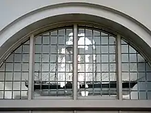 Udsmykningen mellem vinduerne er af Bodil Kaalund og forestiller gamle kristne symboler.