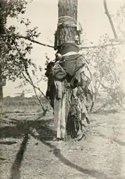 Et bemalet bisonkranie hørte til i offerhytten tillige med f.eks. en indviet gravestok[1] og et rød – og sortmalet grævlingeskind pakket ind i et bisonskind.[1] Dette blev brugt som en primitiv tromme på bestemte tidspunkter.[1]