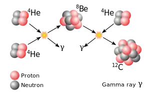 Sammentrækningen af centralregionen får dennes temperatur til at stige, så den til slut når 108 K. Ved denne værdi begynder fusion af helium til kul (kaldet triple-alfa-processen). Den ekstreme tæthed i centrum, der er af størrelsesordenen 106 g/cm3, og den dermed forbundne neutrinoafkøling betyder, at fusionsreaktionen først tændes i en varmere kugleskalzone uden om centrum. Den frigivne energi ville almindeligvis medføre en ekspansion af kernen med en tilhørende stabilisering af temperaturen. Kerneområdet befinder sig imidlertid i en særlig kvantemekanisk degenereret tilstand, som medfører, at energien bruges til at ophæve denne. Derfor vil en stabil tilstand ikke være mulig, og heliumfusionen vil sætte ind i form af en gigantisk eksplosion, der betegnes som et heliumglimt (helium flash).[24] Glimtet betyder, at solens lys i flere sekunder stiger til 1010 L0, hvilket svarer til ca. 10 % af hele Mælkevejens lysstyrke.