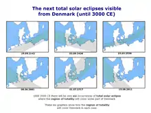 Grafikken til venstre viser hvor, og hvornår fremtidige solformørkelsers totalitetszone vil bevæge sig ind over Danmark. Der vil kun forekomme i alt 6 af sådanne fænomener inden år 3000.