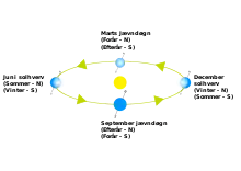 Det ene solhverv, hvor solen er længst nord for ækvator, indtræder omkring 21. juni (i Danmark kaldet sommersolhverv), og det andet, hvor solen er længst syd for ækvator, indtræder omkring 21. december (i Danmark kaldet vintersolhverv).