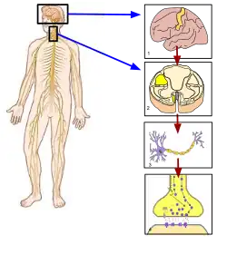 ![]() 1. (Hjerne) Præcentrale gyrus: oprindelsen af de nervesignaler der starter en bevægelse. 2. (Tværsnit af rygsøjlen) Corticospinale trakt: Mediator af beskeden fra hjernen til skeletalmusklerne. 3. Axon: budbringercellen, der bærer kommandoen om at kontrahere muskler. 4. Motoriske endeplade: Budbringer axon-cellen fortæller musklen af den skal trække sig sammen i dette punkt. | |