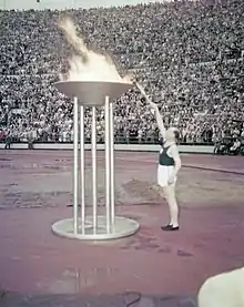 Den olympiske ild tændtes af løberheltene Paavo Nurmi (på stadion) og Hannes Kolehmainen (på stadiontårnet), noget der havde været hemmeligholdt indtil det allersidste[23]. Da det blev annonceret, at Paavo Nurmi ville ankomme til stadion, sprang idrætsfolkene til frem for at bedre kunne se legenden i levende live. Kun de sovjetiske og finske rækker forblev intakte[22]. Faklen blev bragt op ad trapperne i det 72 meter høje stadiontårn af fire fodboldspillere, hvorpå Hannes Kolehmainen tændte den olympiske flamme på toppen af tårnet.[23]