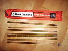 Lavineudstyr, søgningsudstyr og redningsudstyr (venstre til højre): lavinerygsæk (airbag), adskilt lavinesonde, skovl, lavinebipper.
