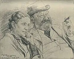 ![]() Sophus Schandorph med hustru, født Branner. Tegning fra 1894 af P.S. Krøyer. | |