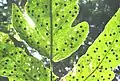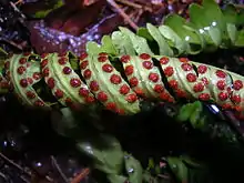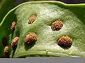 Sporehushobe optræder på sporofytten og sporangierne producerer haploide sporer ved meiose. Når sporerne modnes bortfalder eller opløses indusiet. Sporangiet brister til sidst og sporerne frigøres.