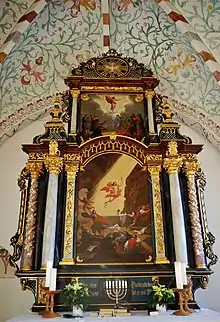 Alterbordet, der er muret og hult, opførtes 1783. Altertavlen fra 1783 er udført af snedkermester Christensen fra Sottrup med anvendelse af dele fra en ældre tavle fra 1703. Den gamle altertavle var så medtaget af svamp og orm, at den måtte nedbrydes og erstattes af en ny, dog således at »tavlen« (dvs. storfeltet) og de to piller fra det gamle alter genanvendtes. I den nye tavles storstykke indgår den gamles storfelt, der flankeres af korintiske pilastre med pålagte akantusbladranker, samt af de gamle, glatte trekvartsøjler, der af rammeværket er skudt frem i planet; her udenfor står bladsmykkede snosøjler i plan med storfeltet. De smalle rokoko-storvinger er smykket med akantusblade og klokkeblomster. Postamentfeltet er tredelt og har flade fremspring for pilastrene, større for storsøjlerne. De sidstes barnehoveder er fra den gamle tavle. Over storfeltet skyder gesimsen sig i en bue op i topfeltet, der flankeres af glatte, korintiske søjler på frie postamenter; topstykket består af en gennembrudt oval med Helligåndsdue i stråler, omgivet af gitter- og rocaille værk. Ud for søjlerne står gitterværkspostamenter med vaser.