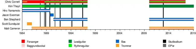 - Chris Cornell – forsanger (1984–1997, 2010–2017), rytmeguitar (1988–1997, 2010–2017), trommer (1984–1985); død 2017