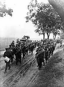 a. ^ Increasing numbers of KOP units, as well as most Polish Army units stationed in the East during peacetime, were sent to the Polish-German border before or during the German invasion. KOP forces guarding the eastern border numbered around 20,000.[4] On 21 September 1939, an improvised KOP "army" had a strength of 8,700 troops. Polish army units which fought the Soviets had mostly been disrupted and weakened by their retreat from the Germans, making estimates of their strength problematic; it is estimated about 250,000 of such troops found themselves in the line of Soviet advance and offered sporadic resistance.[4] The total Polish army on 1 September 1939, counting un-mobilised (and sometimes, never mobilised) units, numbered about 950,000.[2] Historians agree that the vast majority of these forces never saw action against the Soviets.