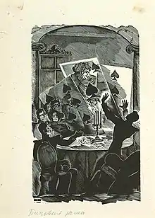Træsnitsillustration af Aleksej Kravtjenko til udgivelse af Spar Dame fra 1940'erne.