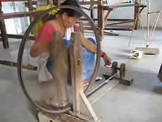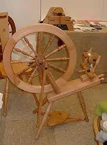Kvinde spinder tråd med hånden i et lille væveri i byen Tezpur i den indiske delstat Assam 2006. Hun roterer hjulet med højre hånd, og styrer fibrene med venstre. Bagved ses dele af vævestolen og til højre et enkelt haspetræ til at vikle garnet op i hasper og bundter.