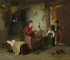 «Familie med kvinde ved spinderokken» («Familie mit Frau am Spinnrad») blev malet af tyskeren Hermann Sondermann (1832–1901) i 1879. Motivet viser en kvinde, som arbejder ved vingerokken, mens hun passer børn.