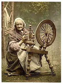 Nostalgisk postkort fra de «gode gamle dage» fra omkring 1900 viser en irsk vingerok af en gammel, kraftig type. Den høje, drejede stav (rokhovedet) kan bruges til at hænge ulden på før spinding.
