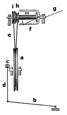Foden på trædebrættet (b) driver krumtapmekanismen (kranken) (c), som får akslen og drivhjulet (a) til at dreje rundt. Rokkesnorene (e) er lagt to gange om drivhjulet, og føres videre rundt om den store trisse (i) til vingen (f) og rundt om den lille trisse (h) til spolen (m). Dermed drives spolen og vingen (spindelen) i forskellige hastigheder. Således snos fibrene (g) til en tråd, samtidig med at det færdigt spundne garn trækkes ind og vikles op rundt om spolen.