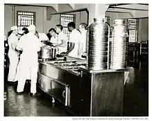 Hvert spisebord havde bænke med plads til seks mænd, selv om mindre borde og stole med plads til fire senere erstattede disse.[8] Alle indsatte samt vagter og embedsmænd spiste sammen; spisesalen havde således siddepladser til mere end 250 mennesker.[8][9] Maden, der serveres på Alcatraz, var efter sigende den bedste i USA's fængselssystem.[6] På anden sal var der et auditorium, hvor der blev vist film vist for de indsatte i weekenden.