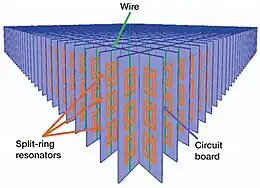 - Shelby, R. A.; Smith, D. R.; Nemat-Nasser, S. C.; Schultz, S. (2001). "Microwave transmission through a two-dimensional, isotropic, left-handed metamaterial". Applied Physics Letters. 78 (4): 489. Bibcode:2001ApPhL..78..489S. doi:10.1063/1.1343489.