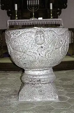 Den romanske granitfont har på kummen løver om fælles mandshoved