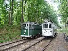 Sideløbende med etableringen af museet begyndte man også at bevare enkelte udenlandske sporvogne, dog primært fra Nordeuropa.[98] Som den første anskaffedes Flensborgs SFV 36 fra 1926, der ankom til Skjoldenæsholm i 1974, efter at sporvejsdriften i byen var blevet indstillet året før.[142] Overtagelsen af den metersporede vogn blev til dels begrundet med kommercielle hensyn. Den daværende vognpark var forholdsvis ensartet, så en fremmed vogn måtte forventes at vække interesse hos publikum. Desuden ville mange kunne genkende den fra besøg i byen lige syd for den danske grænse.[143] Af samme årsag erhvervedes bogievognen ML 74 fra Malmø. Her var sporvejsdriften også ophørt i 1973, men efterfølgende forsøg på at sælge de resterende sporvogne til videre drift var mislykkedes. I stedet endte Sporvejshistorisk Selskab med at få vognen foræret. Vognen er en såkaldt mustang, der blev leveret til flere svenske byer i årene under og efter anden verdenskrig. Dengang var der venstretrafik i Sverige, men da man gik over til højretrafik i 1967, blev vognen ombygget tilsvarende.[144][145]