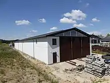Den ændrede økonomiske situation førte til, at remisen blev reduceret til 62 x 29 m, hvilket svarede til størrelsen på den daværende vognpark. Det førte dog hurtigt til pladsmangel i forbindelse med senere anskaffelser.[109] Der var rejsegilde på remisen 2. august 1975, efter at buer, åse og spær var kommet op. Derefter fortsatte arbejdet med tagplader, sider, gavle og porte. Også de første spor i remisen blev lagt.[102][110] Efterhånden regnede man med, at museet kunne indvies 1. august 1976. Byggeriet tog imidlertid længere tid end beregnet, da der var tale om betydelige anlægsopgaver baseret på frivilligt arbejde.[111] Det gjorde det heller ikke nemmere, at arbejdet hovedsageligt blev udført af en trofast styrke på kun 15-20 mand. I Sporvejshistorisk Selskabs medlemsblad BYtrafik blev der derfor flere gange appelleret til de da næsten 700 medlemmer om at bidrage enten fysisk eller økonomisk.[112][113]