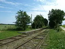 Ved nærmere eftersyn viste det sig, at den Sjællandske Midtbane, også kendt som Midtbanen eller den Midtsjællandske Jernbane, havde gået over herregårdens jorde.[82][85] Banen var blevet åbnet i etaper fra Næstved til Ringsted 1. juni 1924, over Skjoldenæsholm til Hvalsø 15. august 1925 og til Frederikssund 17. november 1928. En påbegyndt forlængelse videre til Hillerød blev derimod opgivet, og 15. maj 1936 blev banen mellem Ringsted og Frederikssund nedlagt på grund af dårlig økonomi.[86][87] Skjoldenæsholm nåede dog at få et trinbræt i 1928 på den modsatte side af Skjoldenæsvej af Sporvejsmuseets nuværende indgang. En bro over vejen blev til gengæld bortsprængt i 1962, da den var for smal til den voksende trafik.[86][87] Jernbanesporene var naturligvis også for længst væk, da Sporvejshistorisk Selskab fik øje på den gamle strækning, hvor der i stedet havde bredt sig en del bevoksning.[88] Men der lå stadig en næsten to kilometer lang ubrudt strækning med intakte dæmninger og gennemskæringer på Skjoldenæsholms jorde. Det ville altså være muligt at anlægge en sporvej der.[71][83]
