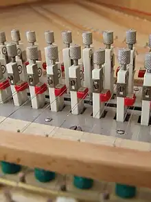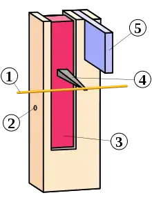 1. Bro; 2. Filt på undersiden af broen; 3. Dæmper; 4. Streng; 5. Plektrum; 6. Tunge; 7. Tungens aksel; 8. Fjeder.