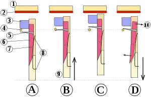 - D. Tangenten slippes, plektret hænger i strengen, men kan passere ved at presse tungen en mm bagud. Derefter kan fjederen skubbe tungen på plads, og springeren er tilbage i udgangspositionen.