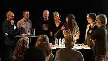 Sproglaboratoriet sendt live fra Bogforum 2015 (fra venstre Henrik Lorentzen, Lars Trap-Jensen, Michael Ejstrup, Helle Solvang (programvært), en ukendt gæst i studiet, Ida Elisabeth Mørch (skjult), Ebba Hjorth og Sabine Kirchmeier-Andersen)