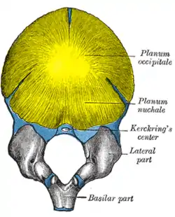 ![]() Occipitalknogle ved fødsel, se nedefra. (Squama occipitalis er øverste halvdel, delen over nakkehullet, vist med gul). | |