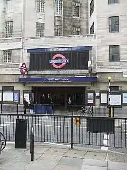Stationsbygningen er indkorporeret i bygningen 55 Broadway, der er London Underground Ltd's hovedkvarter, og har indgange fra Broadway, Petty France og Palmer Street. Stationen ligger tæt på New Scotland Yard og flere regeringskontorer. Stationen er ikke tilgængelig for kørestolsbrugere.