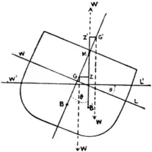 Når et skib flyder på vand, er det påvirket af to kræfter, vægten, der virker lodret nedad, og opdriften, som virker opad. Ligger skibet i stille vand, vil de to kræfter holde hinanden i ligevægt, idet de har fælles virkelinje.