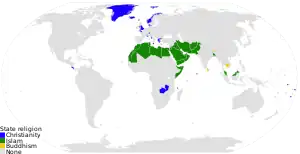 Lande med officiel religion:      Buddhisme      Islam      Shia islam      Sunni islam      Ortodoks kristendom      Protestantisme og Anglikanisme      Den romersk-katolske kirke