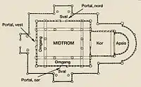 - De enskibede kirker har de bærende stave i hjørnerne i ydervæggene, eventuelt med supplerende mellemstaver i væggene.