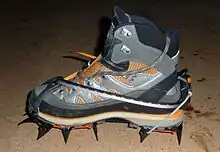 Eksempel på et par steigeisen, der er monteret på bjergstøvler.