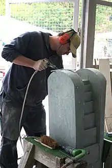 Stenhugger der arbejder på en fontæne med hydraulisk værktøj.