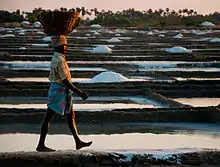 I varme lande bliver salt produceret ved at lade sol og vind fordampe havvand i bassiner. Havvandet ledes ind i store bassiner, hvor fordampningen påbegyndes. Efterhånden som vandet fordamper, stiger koncentrationen af mineraler i vandet. På et tidspunkt begynder mineralerne at udkrystallisere. 77 % af mineralerne er NaCl og til alt held udkrystalliserer salt som det sidste mineral, dvs. til sidst er der kun salt tilbage i vandet, og når vandet er fordampet helt væk, kan maskinerne høste de mellem 8 og 12 cm salt der ligger på bunden af bassinet. Dette salt har et vandindhold på ca. 4 % og en kornstørrelse fra 0,5-5mm.
