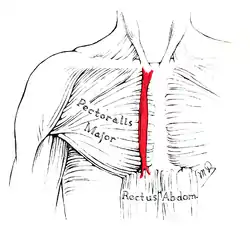 ![]() Sternalis, på linje med Rectus Abdominis og Sternomastoid, blev fundet i 6 % af 535 kadavere (R. N. Barlow) | |
